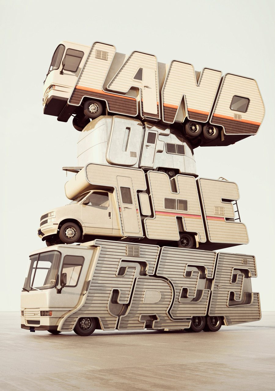 De eerste twee beelden zijn gemaakt door Chris Labrooy. Hij is kunstenaar/vormgever en maakt typografische illustraties zoals ‘Land of the Free’. De copy (Land of the Free) is uiteraard een verwijzing naar het vrije leven dat je leidt als je campert of caravant. Bekijk zijn website eens, dan zie je dat hij echt een eigen signatuur heeft. Ik vind dit dus echt te gek!