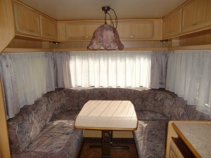 Karin van de Voort  heeft een gigantische caravan. Ze heeft de caravan helemaal omgetoverd tot reispaleis. Alhoewel, reispaleis… de caravan heeft een vaste staanplaats, dus reizen doen ze er niet mee. Toen ze de caravan kochten zat er een grote rondzit in, deze hebben ze vrijwel direct omgebouwd tot een vast tweepersoons bed met lattenbodem. De voortent wordt daarom gebruikt om in te zitten. Verder schilderde Karin de hele binnenkant wit en kregen alle kastjes verschillende knopjes. In de badkamer hangt het vogelhuisjesbehang van Studio Ditte en de rest van de wanden is voorzien van leuk PiP behang.