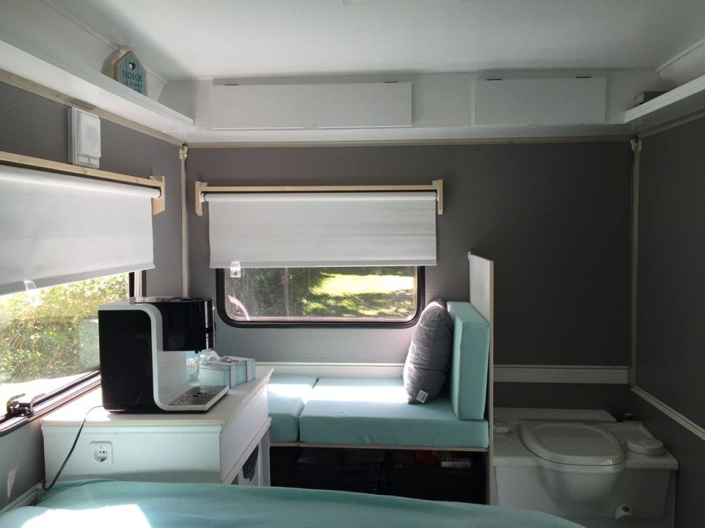 Binnen wilden ze een hotelkamer-sfeer creëren. Het interieur werd geheel gedemonteerd en alles werd gewit. De wanden kreeg een warme tint grijs zodat het meubilair goed tot zijn recht kon komen. Er kwam een verstelbaar bed, een mobiele airco (ja, je doet het goed of niet), tv en toilet. Het vaste inbouwtoilet is geplaatst onder een verhoogde treinzit. de kussens van een zitplaats kun je verschuiven tot een klein bankje. De omhooggedraaide klep is dan de nieuwe toiletruimte. Maar je kunt ook alle kussens platgooien voor een extra slaapplaats. Hoe slim!