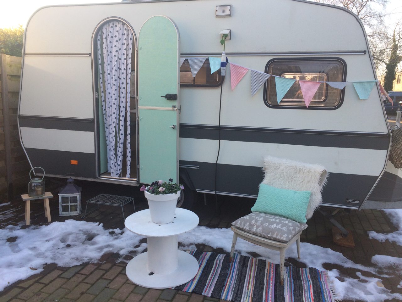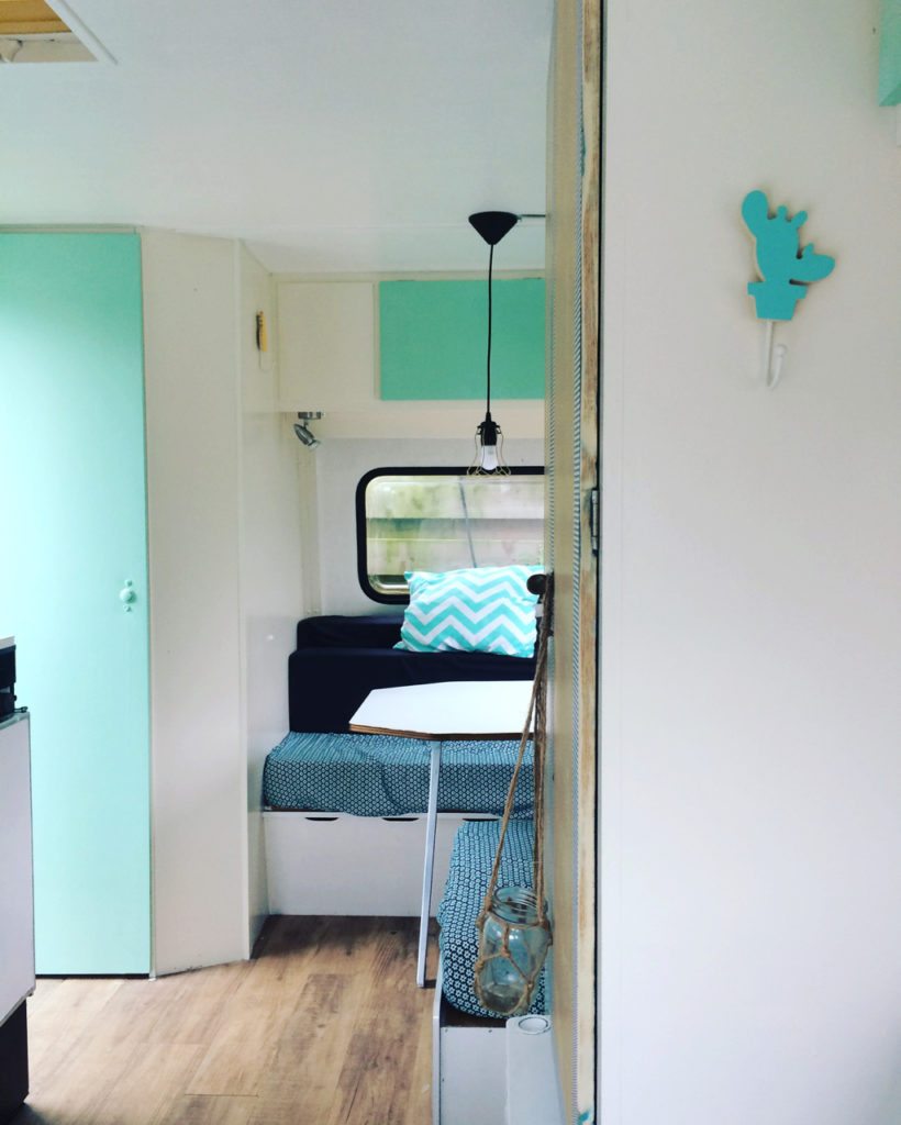 Toen ik vorig jaar startte met mijn eigen bedrijfje in opgeknapte vintage meubels en woonaccessoires, kon ook een vintage caravan niet achterblijven! Het werd een IT uit 1983. Er was mij al iemand voor geweest die hier en daar wat had opgeknapt, maar naar mijn idee veel te donker en extreem. Eerst werd de caravan dus helemaal leeg gehaald en kaal geschuurd om vervolgens het langzaam laag voor laag weer om te toveren in een prachtig exemplaar. Ik heb veel gebruik gemaakt van de materialen van de Kwantum. Zowel de WOW verf in de mooie mint-kleur als het geometrisch behang vond ik erg goed passen in deze caravan. Ik heb gekozen voor een zwart/witte keuken en dat heb ik ook in de kledingkast terug laten komen. Één van de keukenkastjes heeft schoolbord plakplastic waardoor je leuk kan variëren met verschillende teksten. Ook de toiletruimte onderging een metamorfose en zo was deze oude caravan van alle gemakken voorzien. Toen ik hem te koop zette, werd er meteen veel en enthousiast op gereageerd. Voor mij reden genoeg om meteen weer op zoek te gaan naar een nieuw exemplaar. Ondertussen is deze IT caravan verkocht en staat er nu een wit/blauwe Knaus uit 1979 op mij te wachten….’
