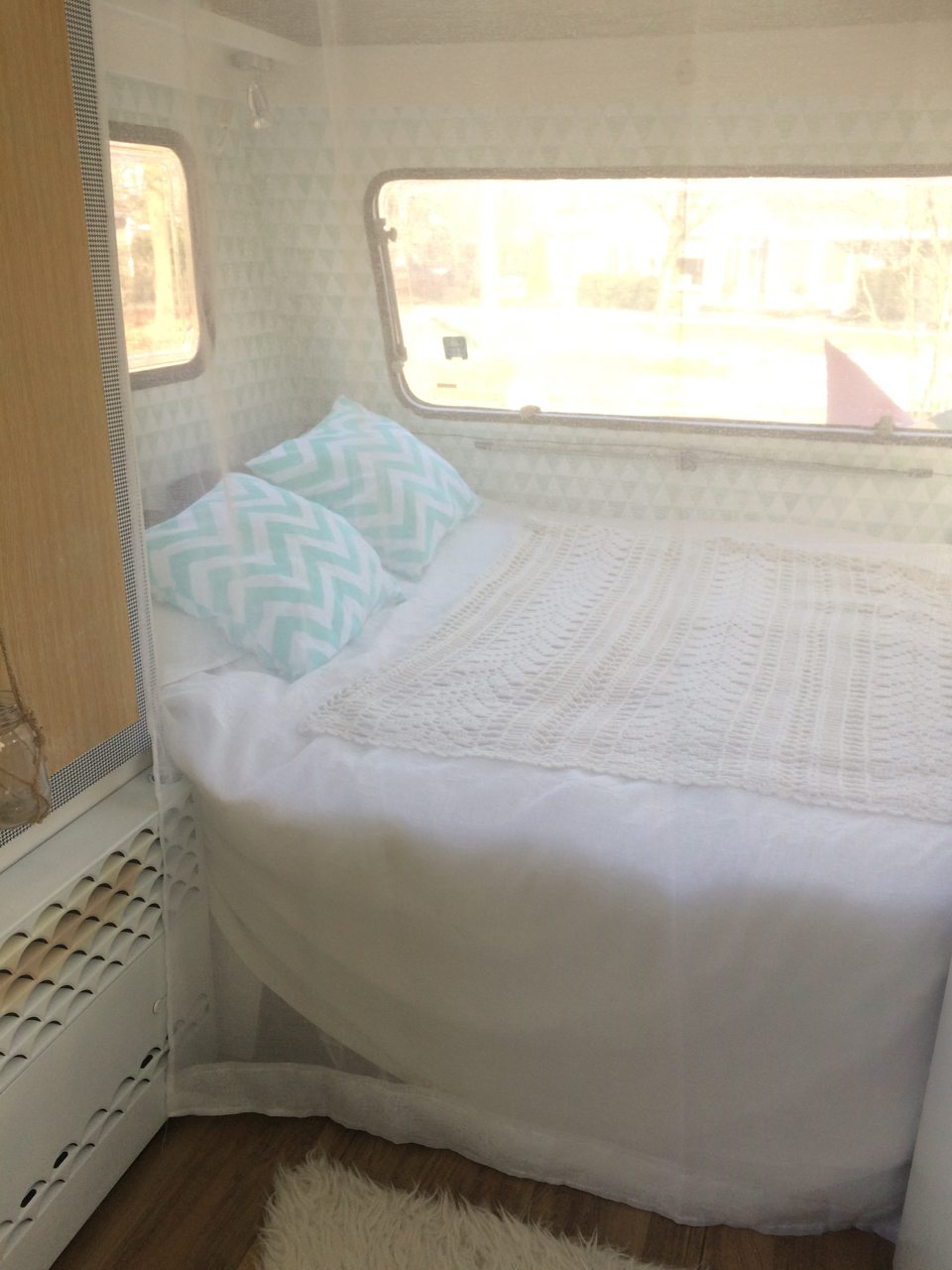 ‘Na jarenlang met de caravan op vakantie te zijn geweest, kwam er het moment dat ik de wereld van het caravan pimpen ontdekte! Mijn eigen caravan mocht natuurlijk meteen een metamorfose ondergaan. De basis was al wit, wat veel werk scheelde. De kastdeurtjes werden geel, er kwamen nieuwe deurknoppen en gordijnen en ik veranderde de verouderde Adria in een hippere variant.