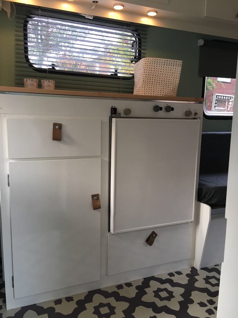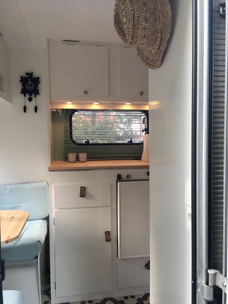Ingrid wilde al heel lang een caravan kopen en opknappen en nu kwam het er eindelijk van! Ze kocht niet een 30 jaar oude Kip Kompakt 420 en ging rigoreus aan de slag. Alles moest er aan geloven en er werd flink op los gekwast en gestoffeerd. De combinatie licht en donker vind ik erg leuk geworden. Het lichte maakt de Kip lekker ruimtelijk en het donkere geeft sfeer. Een favoriet van mij blijft de rieten hoed. Het staat voor mij synoniem aan vakantie, zon op je bol en geeft mij een ‘T-maakt-mij-niet-uit-hoe-mn-haar-zit-ik-ben-op-vakantie’ gevoel.
