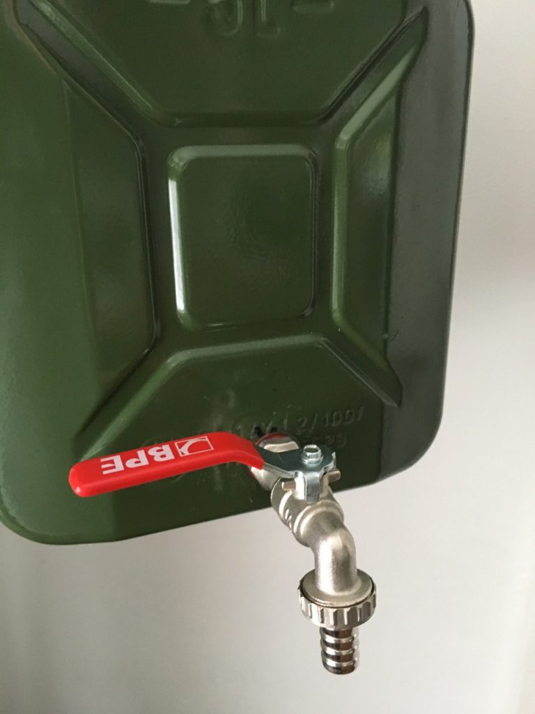 Check de watertank. Hoe gaaf! Ze haalden de jerrycan bij jerrycanshop.nl. Ze boorden er een gat in dat 2 mm kleiner was dan de kraan, teflon tape en dan erin draaien en afritten met een dun randje siliconen kit.