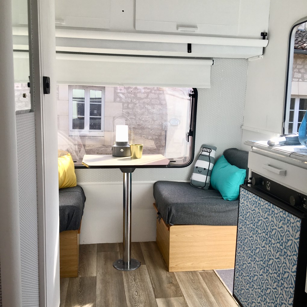 De Swift is niet meer te herkennen van hoe hij ooit is geweest. Wat een fris en stijlvol vakantieplekje is het geworden. Als je zo’n plaatje van een caravan hebt moet het ‘beesie’ ook een naam krijgen. Rebecca doopte de Swift tot ‘Betsy Ré’ . ‘Ré’  omdat het eiland Ile de Ré hun favoriete vakantiebestemming is. ‘Betsy’, omdat het zo lekker klinkt.