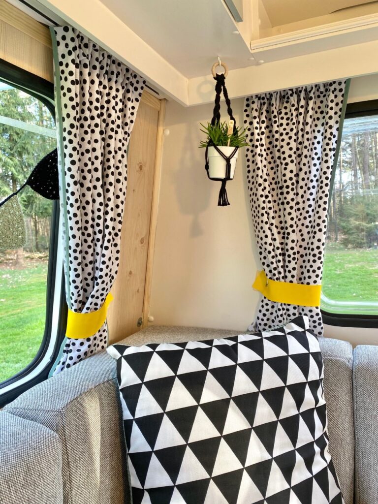 Het tafelblad is vernieuwd met een plaat populierhout; dit heb ik ook terug laten komen op het aanrechtblad. De kastjes hebben een hele zachte groentint (Flexa kleur – Tranquil dawn) en buiten heb ik de stoere neef van deze kleur gebruikt (Flexa kleur – Greygreen). Rik had slechts één wens met betrekking tot de styling, en dat was dat ik ‘iets’ zou doen met de keur geel, geïnspireerd op het logo van C.A.T. Deze frisse kleur is terug te zien in de gordijnlussen, het hanglampje en de sierkussentjes. Als finishing touch kreeg ‘ie aan de buitenkant de te gekke sticker van Missrebelqueen.