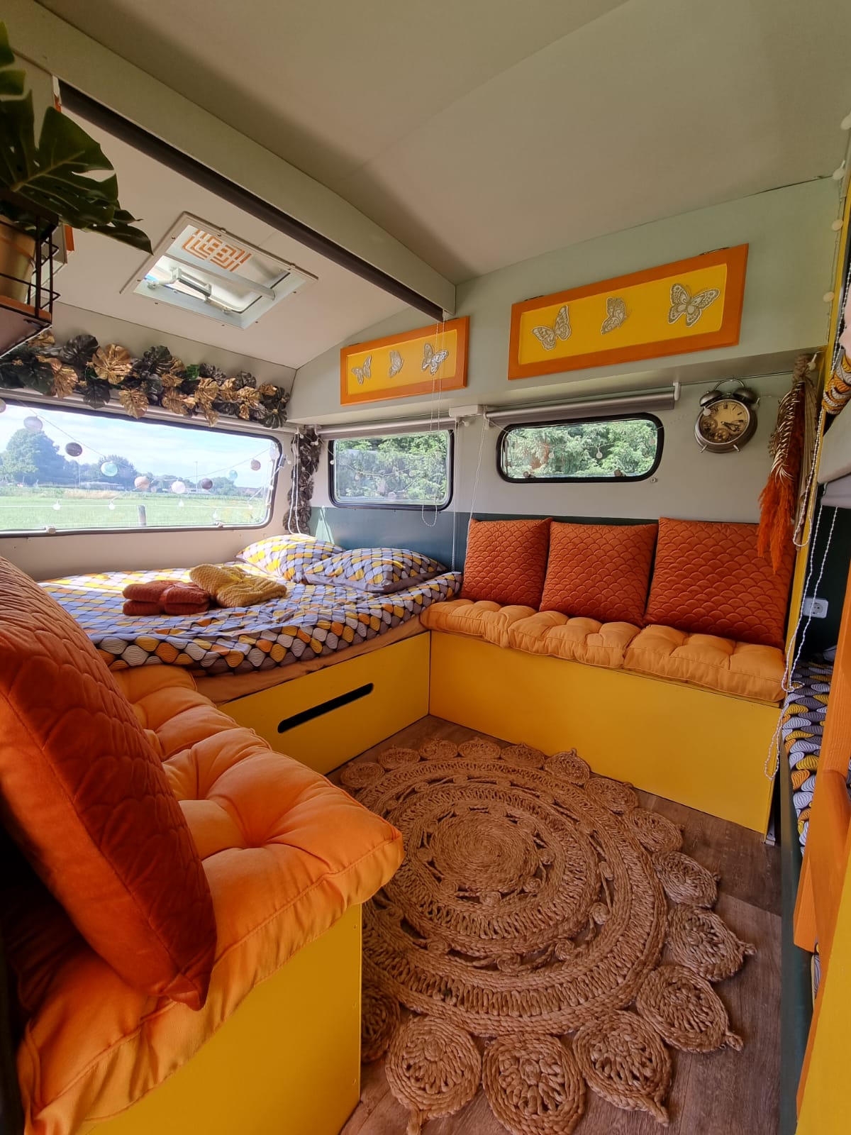 Toen alle technische zaken beter op orde waren, was het eindelijk tijd voor de afwerking. De styling heeft Linda helemaal afgestemd op onze mooie Campooz luifel – alle kleuren en accessoires zijn er zorgvuldig op afgestemd (vinden wij heel leuk!). Het skylederen plafond pakte ze aan met krijtverf (zoals we hier adviseren), al het houtwerk met een goede traplak. Drie lagen zorgden voor een mooi en slijtvast resultaat.