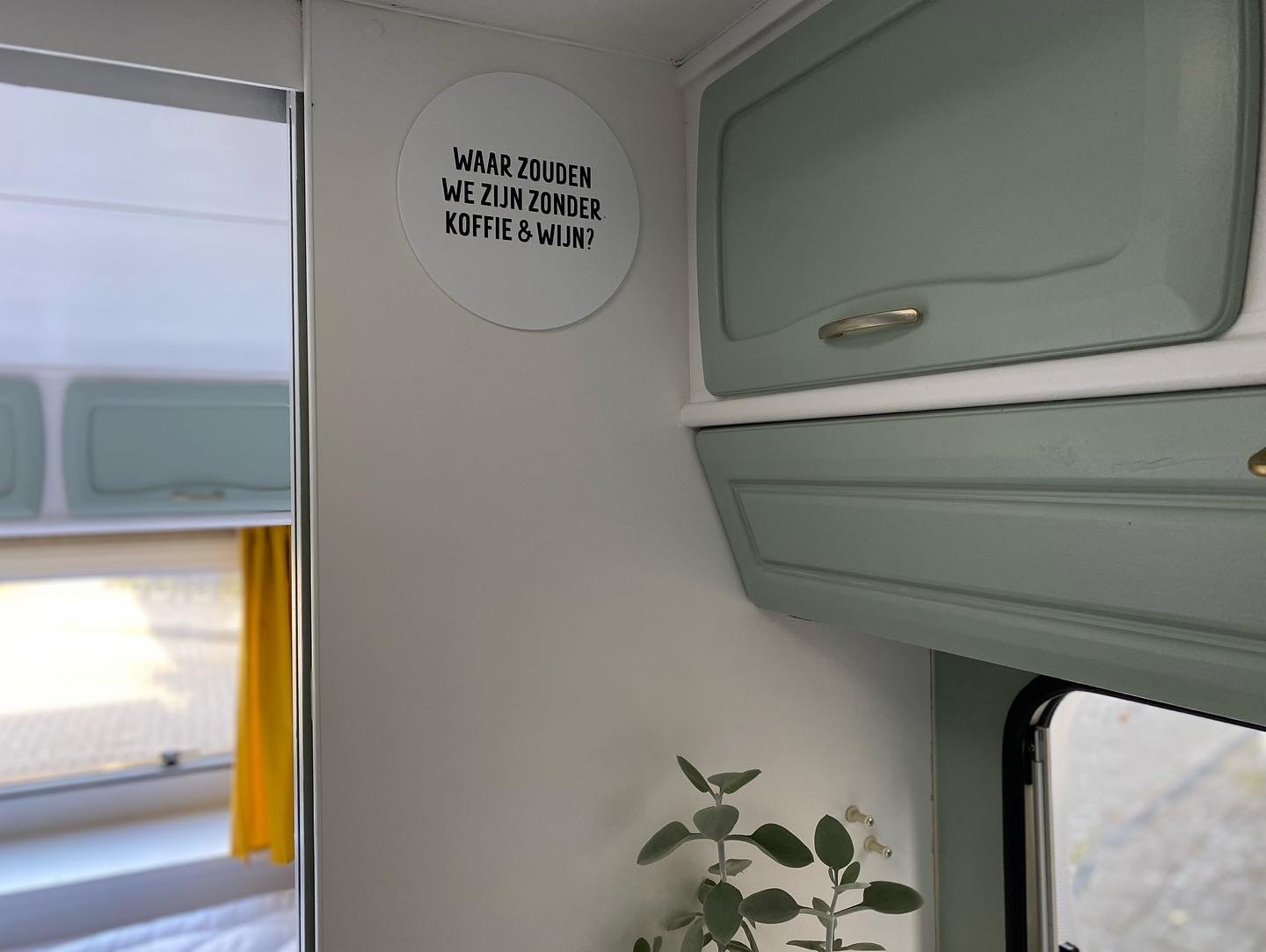 De treinzit bleef wel, die kreeg frisse nieuwe kussens van NoFruit.nl. De kastdeurtjes kregen een mooi groen kleurtje, en de deurtjes waar glas in zat kregen een rotan raster (webbing). De rest van de caravan werd wit geschilderd, en hier en daar zit er een stukje plakfolie op de wanden en in de kastjes. Daarna kwam de afwerking: gordijntjes vervangen, accessoires ophangen en neerzetten. En kijk, hoe leuk is die muurcirkel van Hofje van Kieka!