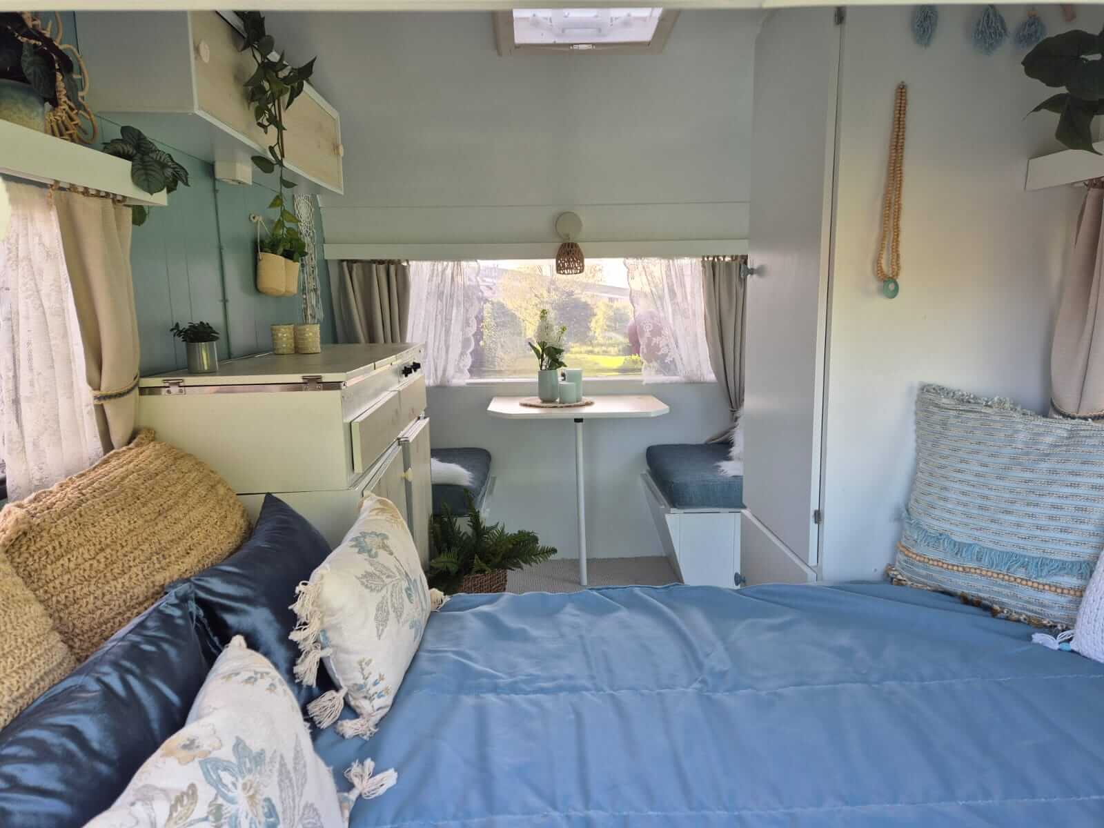 Tijdens corona ontstond het idee van een plek voor haarzelf. Een plek om te leren en even terug te kunnen trekken. Zonder een concreet plan werd de Wilk haar creatieve project: kastjes gewrapt, tafels opnieuw gedaan (meerdere keren), geverfd, een nieuwe vloer gelegd. De buitenkant moest twee keer over, want de eerste keer begon het te regenen. Maarten zorgde dat alle elektra tiptop was. Mede dankzij twee Caravanity Klusweekenden werd de Wilk echt helemaal naar wens.