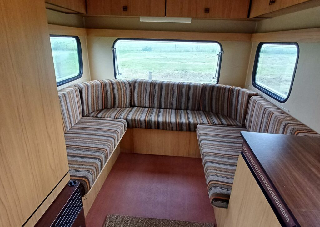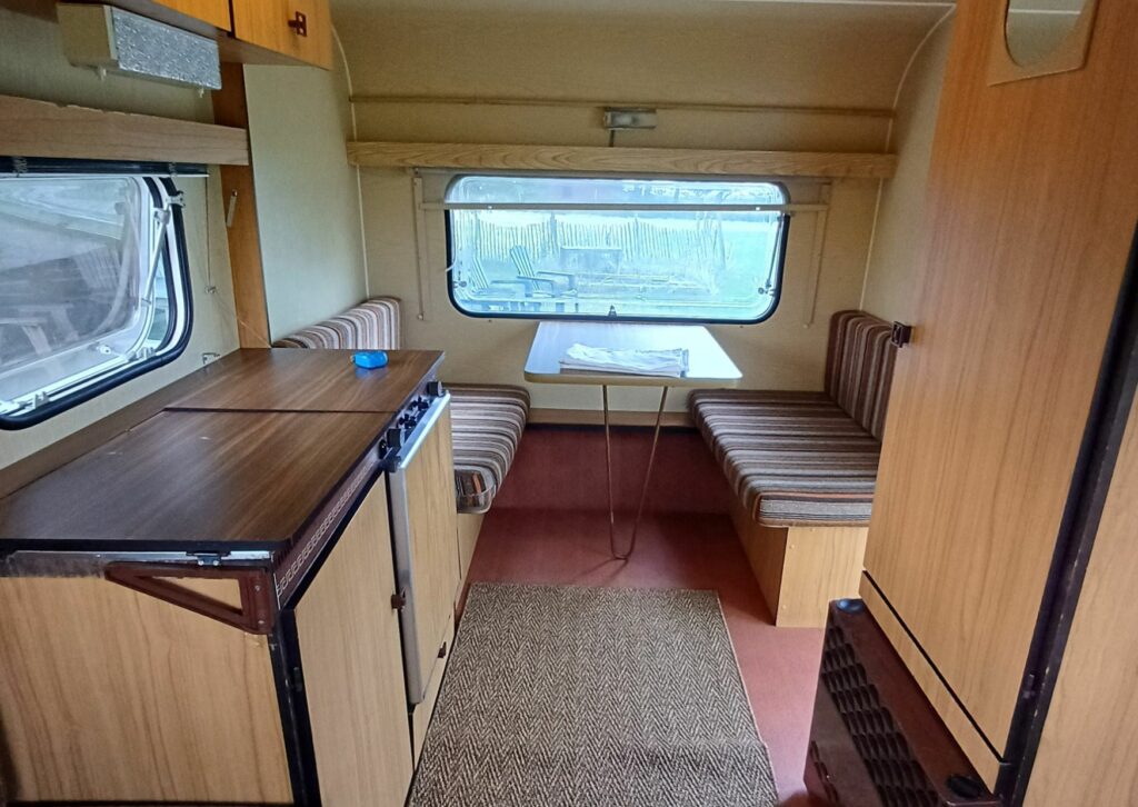 De caravan zag er van buiten nog goed uit en ook binnen waren veel originele elementen nog mooi. De wandbekleding, het plafond en zelfs de vloer konden blijven. Het originele geel-oranje dakraam zorgt bovendien voor een warme gloed, waardoor het lijkt alsof de zon altijd schijnt in het interieur.