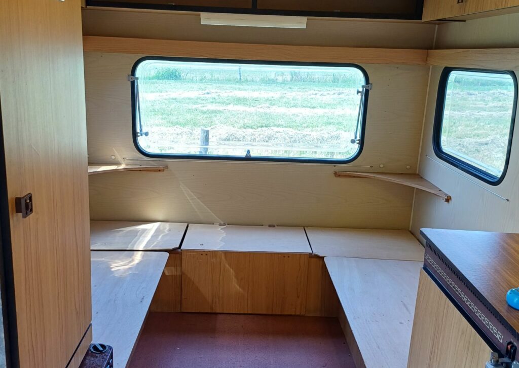 Aan de andere zijde van de caravan maakte haar man van het vrijgekomen materiaal juist weer een nieuwe rondzit. Zo kan Geke ook heerlijk languit zitten met de benen omhoog. De constructie is zelfs zo gemaakt dat er weer een bed van te maken is. Handig als er eens gezelschap langskomt, want het tafeltje kan eenvoudig worden aangehaakt.