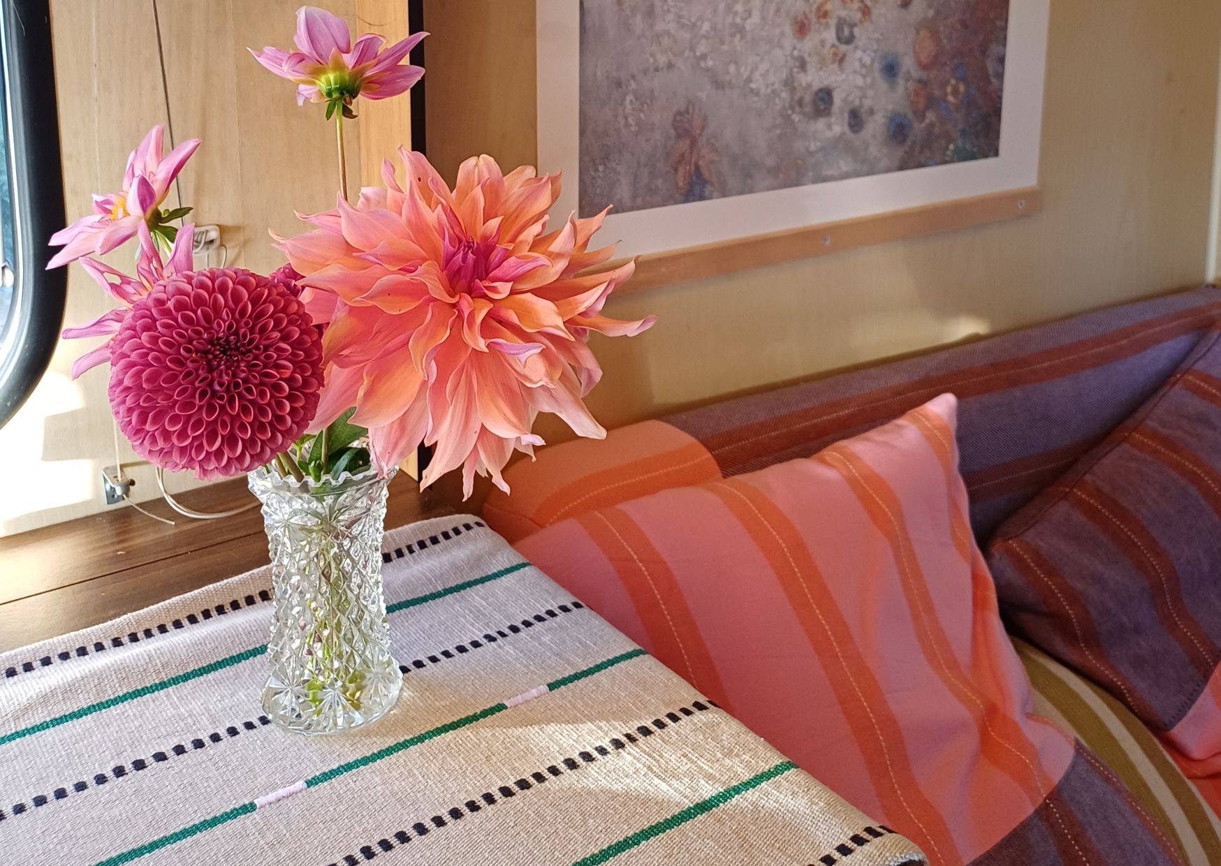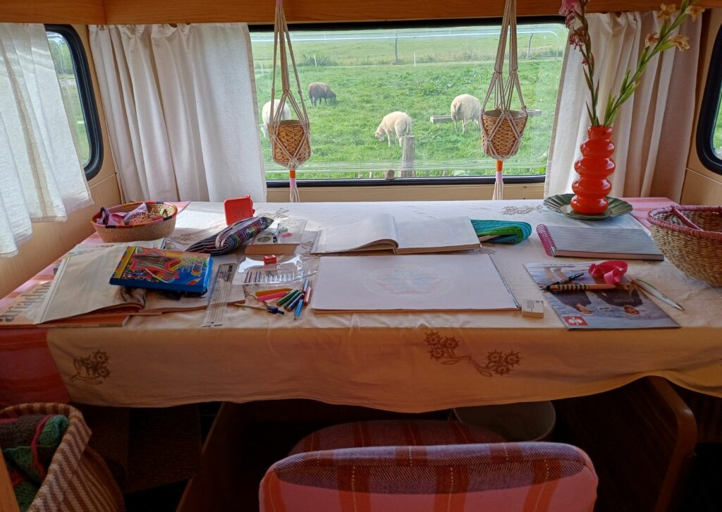 Het caravanatelier wordt inmiddels volop gebruikt. Geke heeft er al genaaid, getekend, geschilderd, online lessen gevolgd, gelezen en (zoals ze zelf ook zegt) ook heerlijk geluierd. Precies zoals ze het voor ogen had.